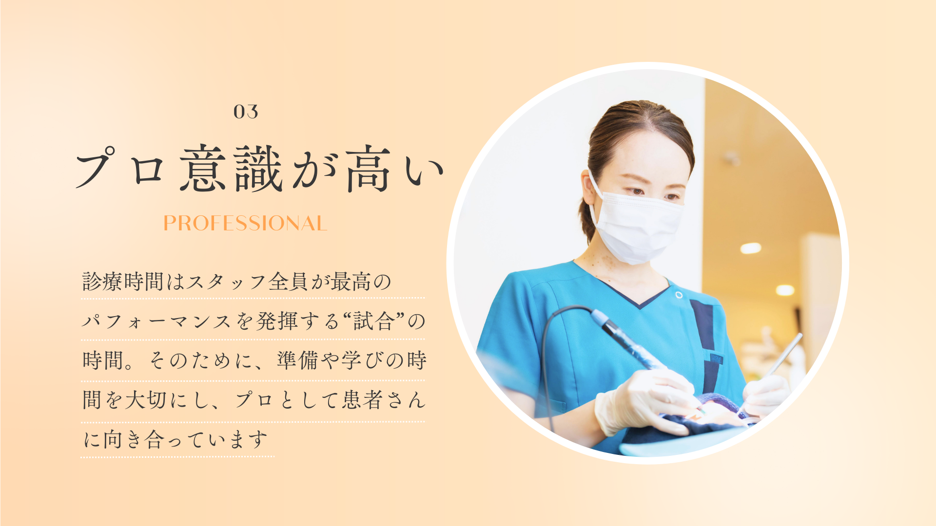 「来てよかった」「また来たい」と通いたくなる歯科医院こそ、患者さんの健康を本質的にサポートできる場所だと考えているからです。