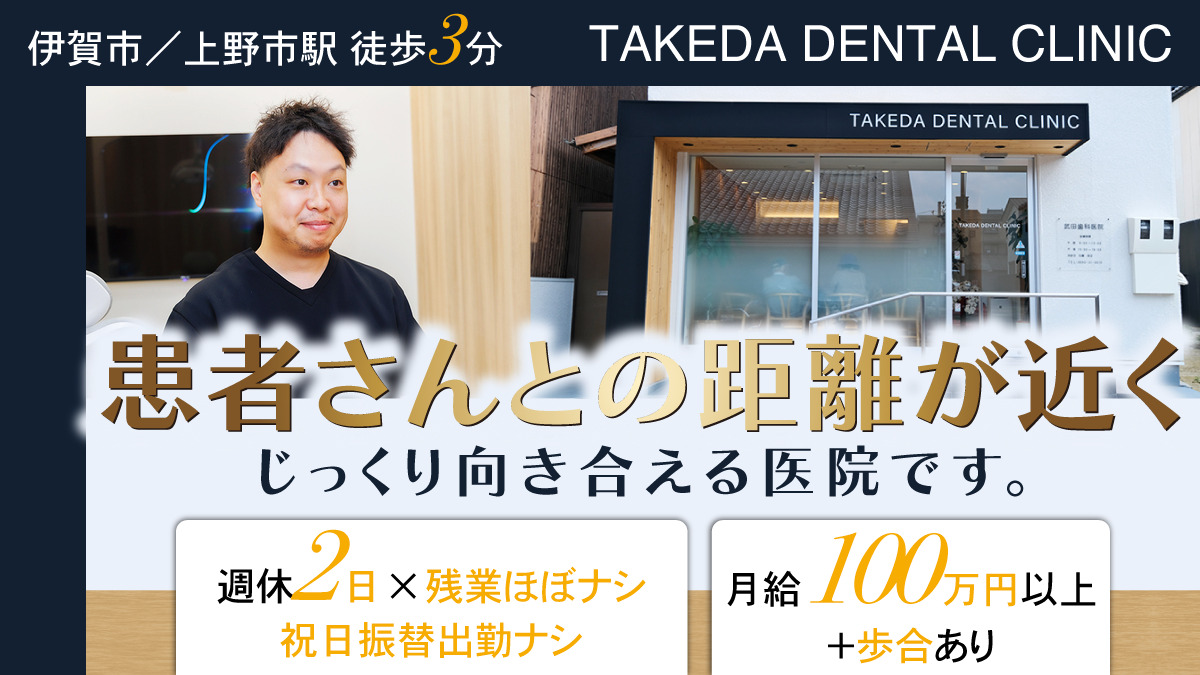 1️⃣ <伊賀市・上野市駅徒歩3分>住宅手当ありで三重での一人暮らしを応援◇三重県伊賀市「上野市」駅徒歩3分の当院は、2025年4月に建て替えたばかりの新しく清潔な医院です。院内は完全個室で、プライバシーに配慮し安心して相談できる環境を整えています。インプラントや歯周外科を専門に精度の高い診療を提供し、患者様一人ひとりの希望に寄り添いながら、保険・自費を問わず最善の治療を提案。さらに非常勤専門医との連携で口腔外科や矯正にも対応し、予防・メンテナンスにも注力することで、幅広い世代に選ばれる医院を目指しています。
