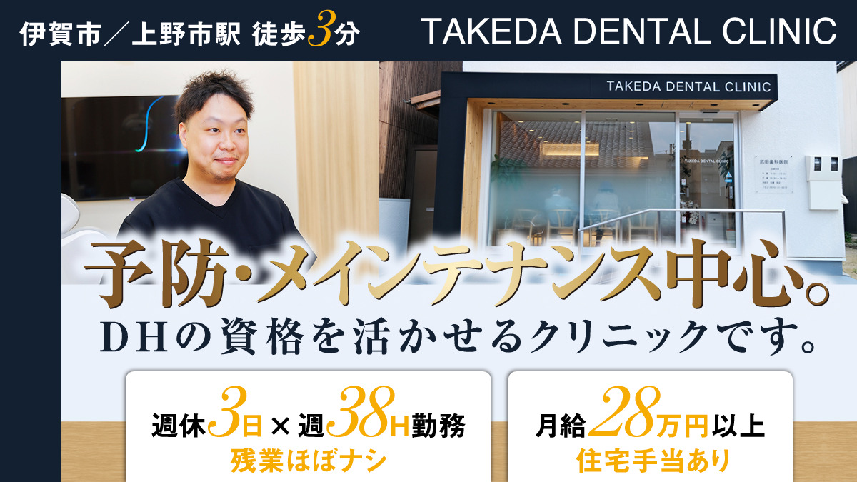 <伊賀市・上野市駅徒歩3分>週休3日×週38H勤務×残業ほぼナシ★月給28万円以上★新築ピカピカの医院◎予防・メインテナンス中心で衛生士の資格を活かして活躍できる医院です♪